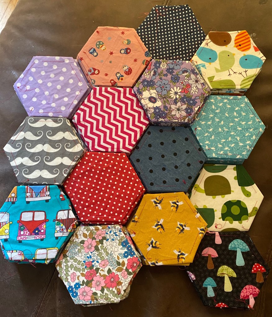 270 of these wee suckers cut out and tacked and I’m now on the task of sewing them all together to make the front of a quilt (before actually learning how to make a quilt…) My hands have been super sore (cheers for another gift, chemo) so I’ve avoided doing this until now but I’m super enjoying this project and, like reading, it’s lovely to have a visual focus for recovery but perhaps less lovely to have scraps of fabric and teensy bits of thread all over my living room. Makes a change from being covered in dog hair, I suppose.